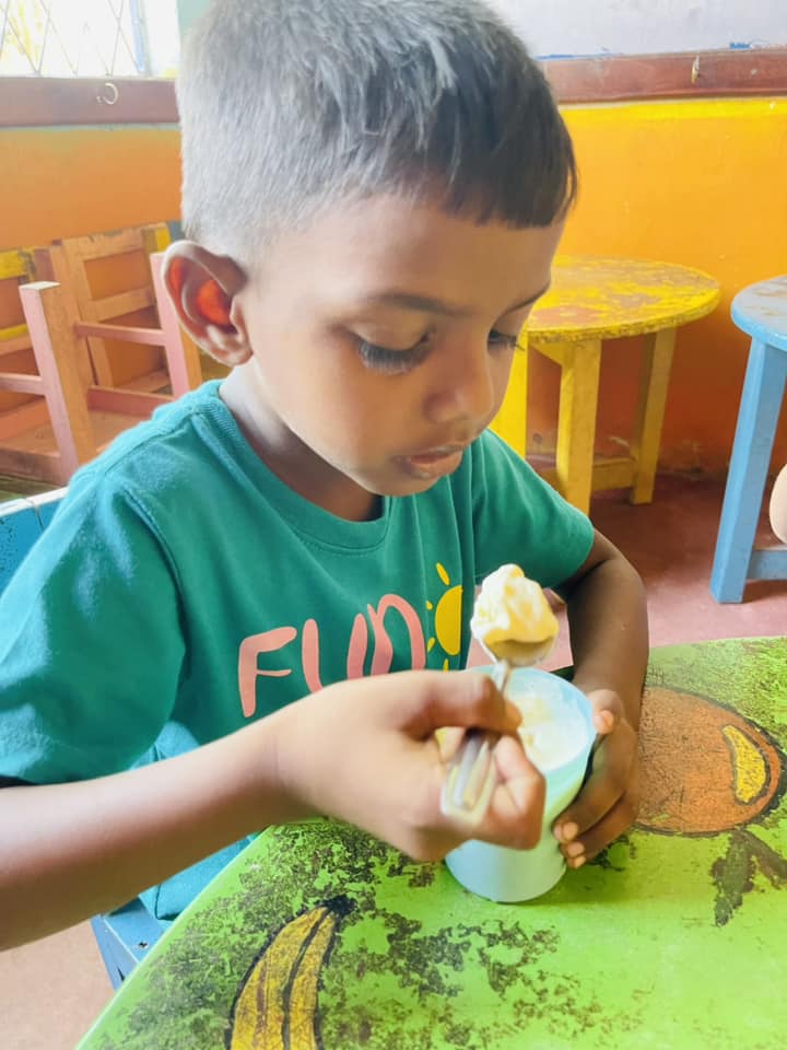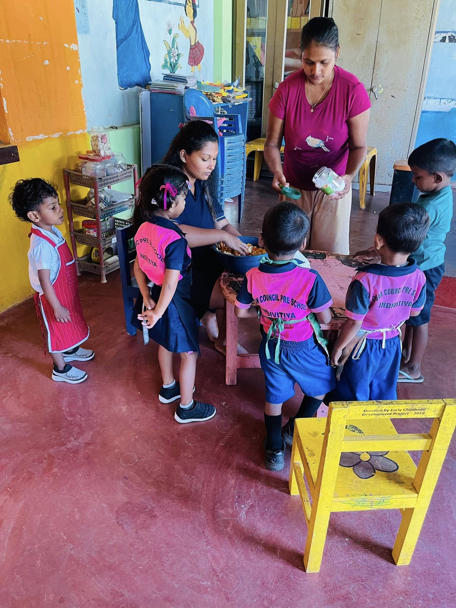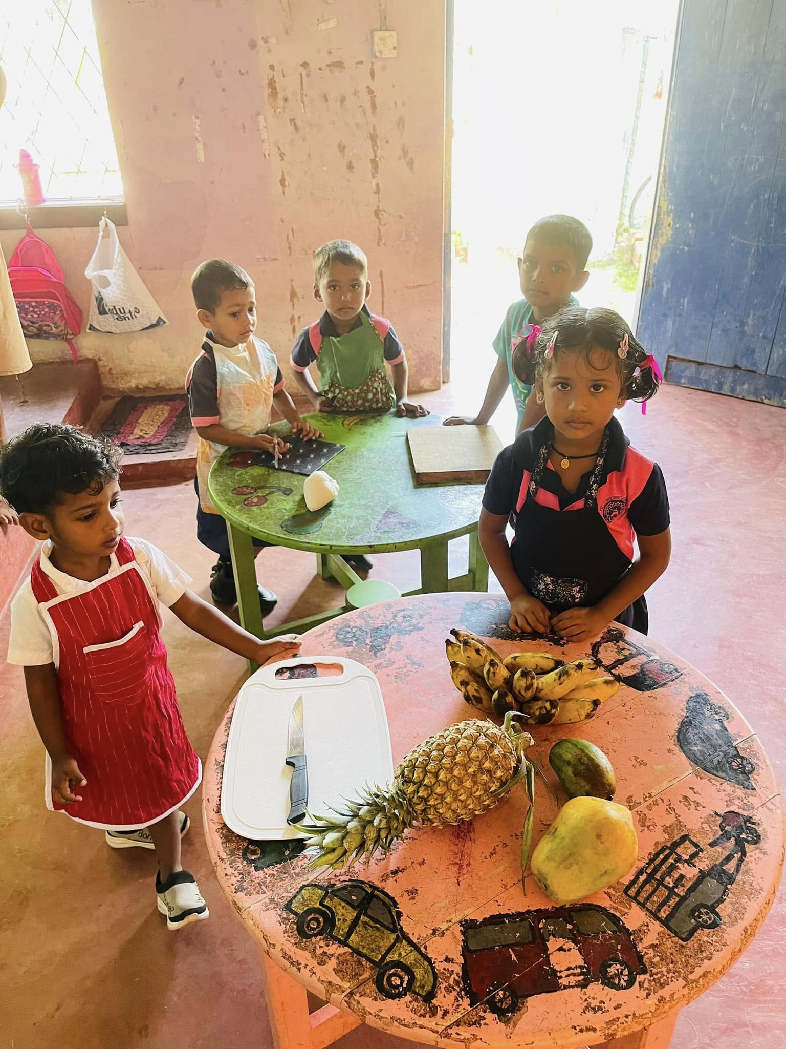 දරුවන් සමග එක්ව පලතුරු මිශ්රණය සෑදීම.