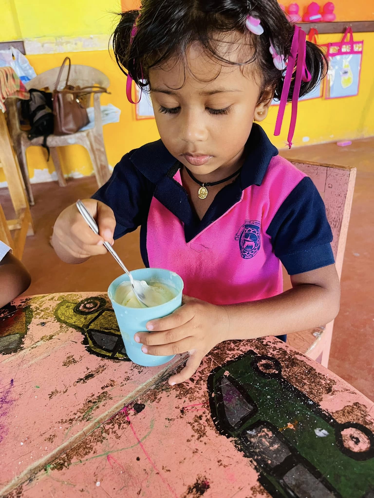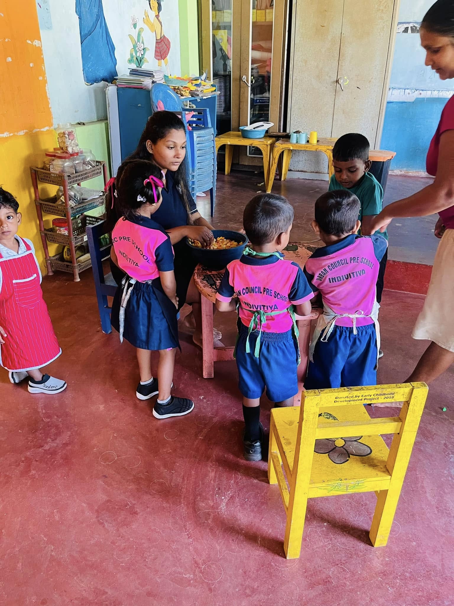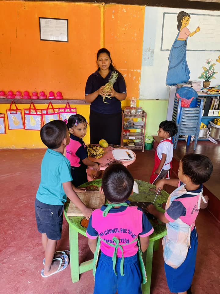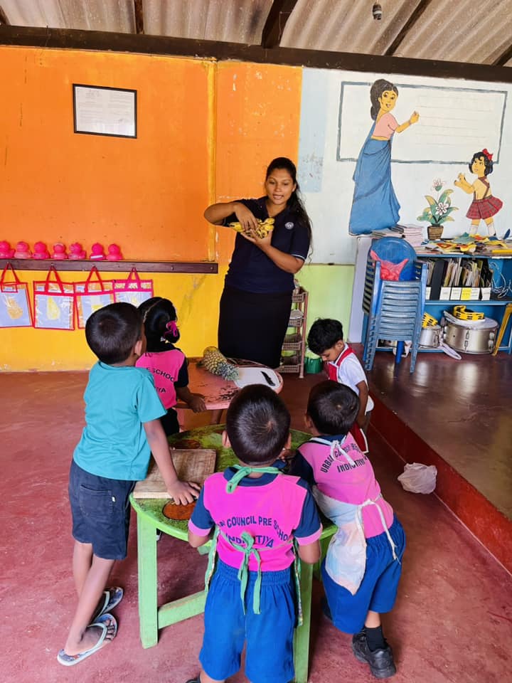 දරුවන් සමග එක්ව පලතුරු මිශ්රණය සෑදීම.
